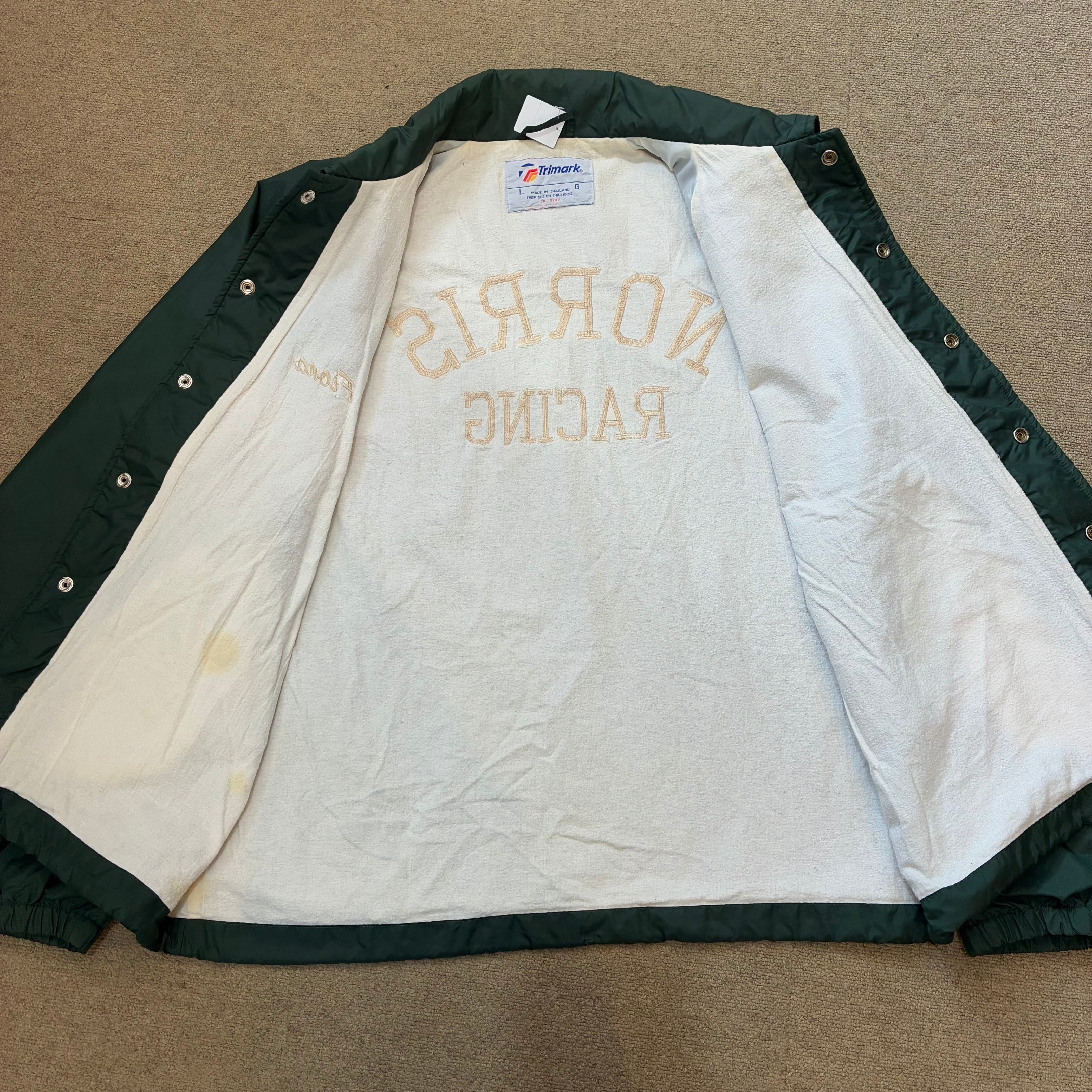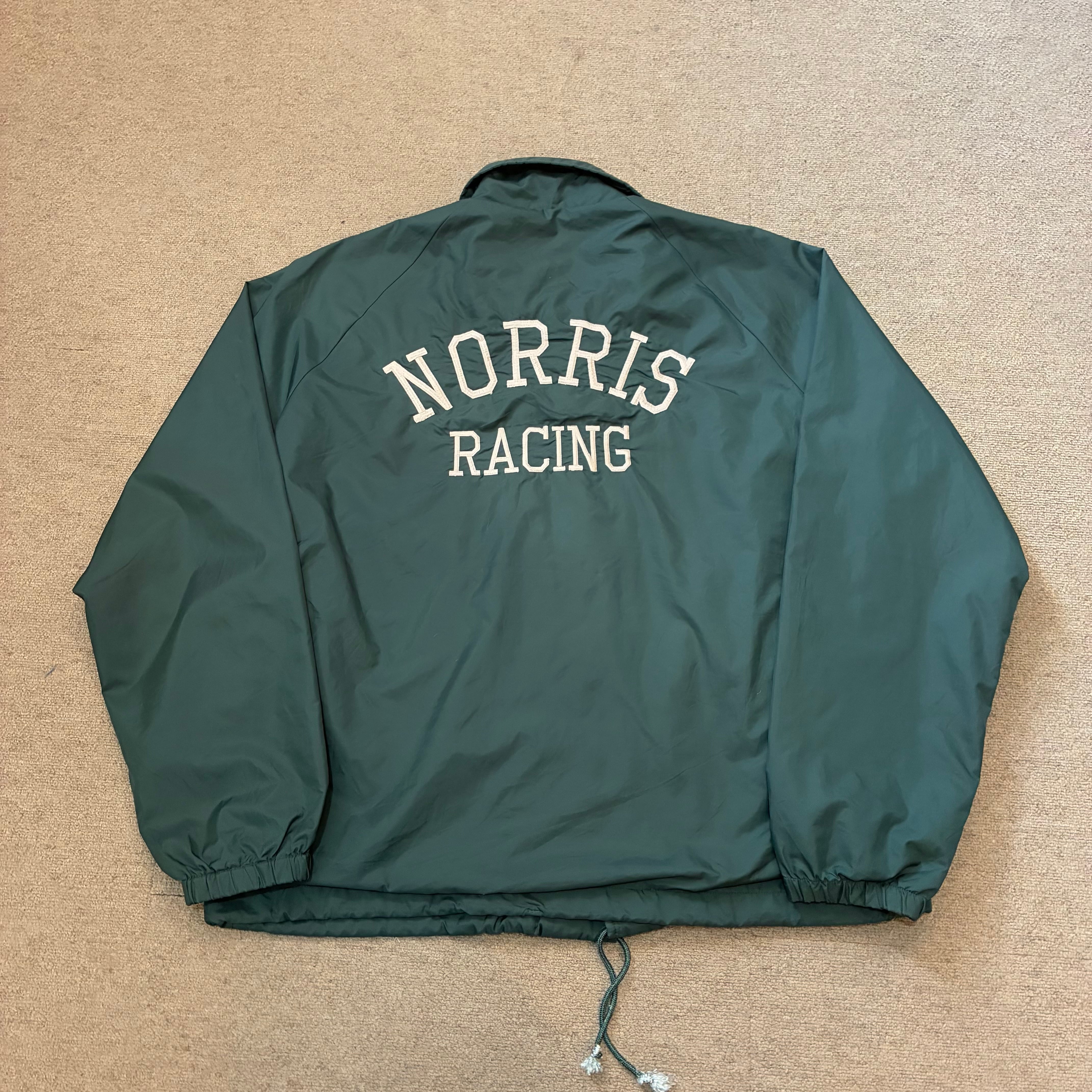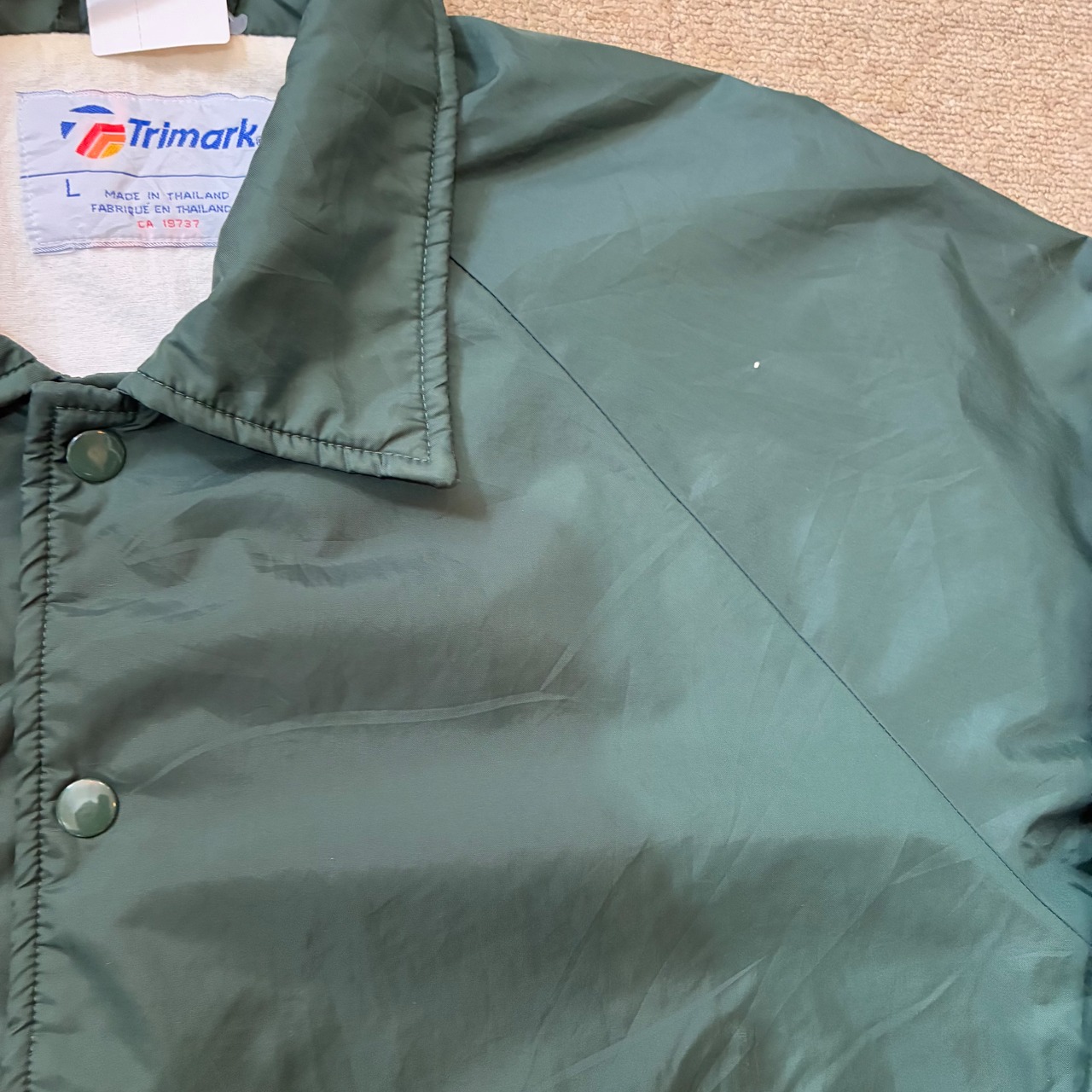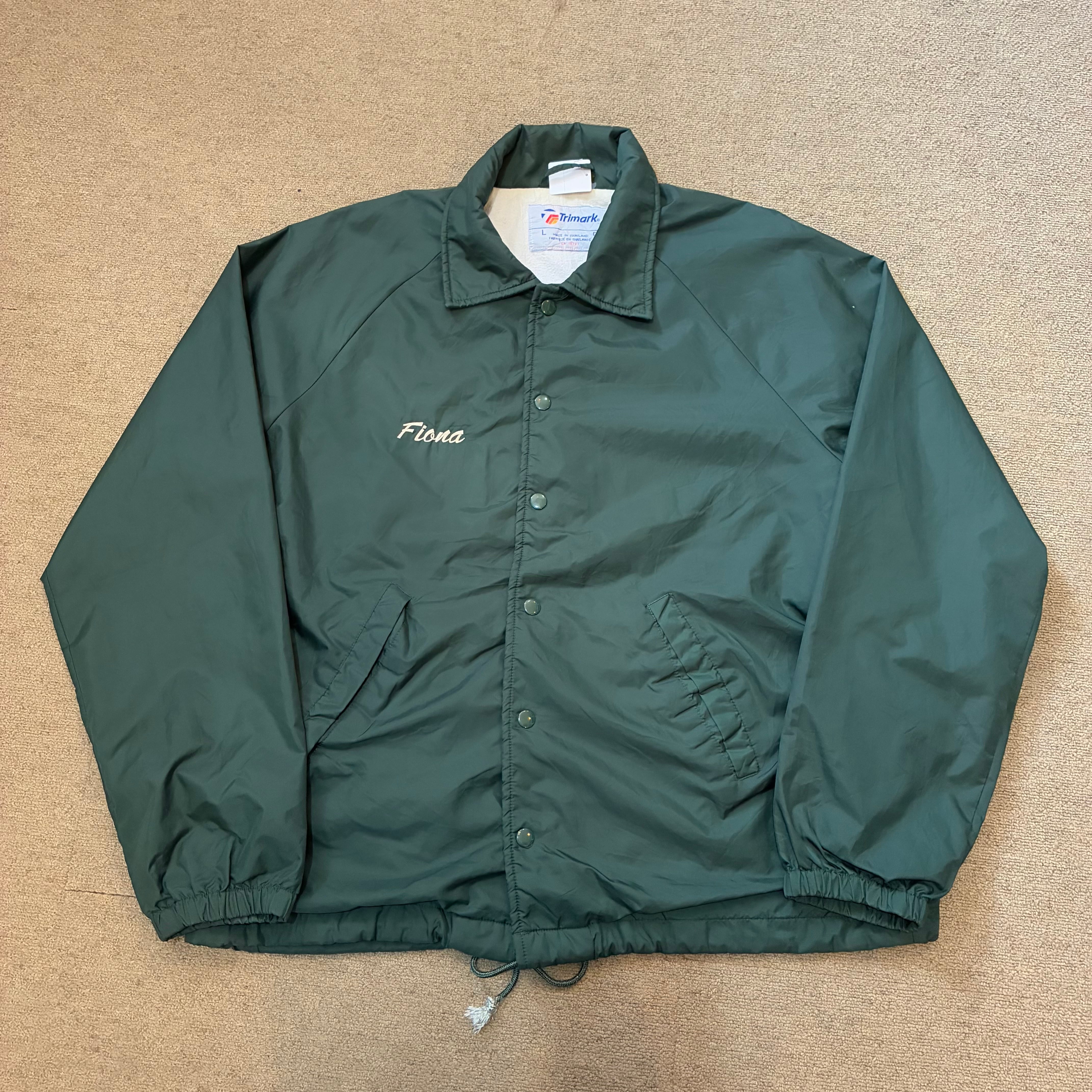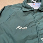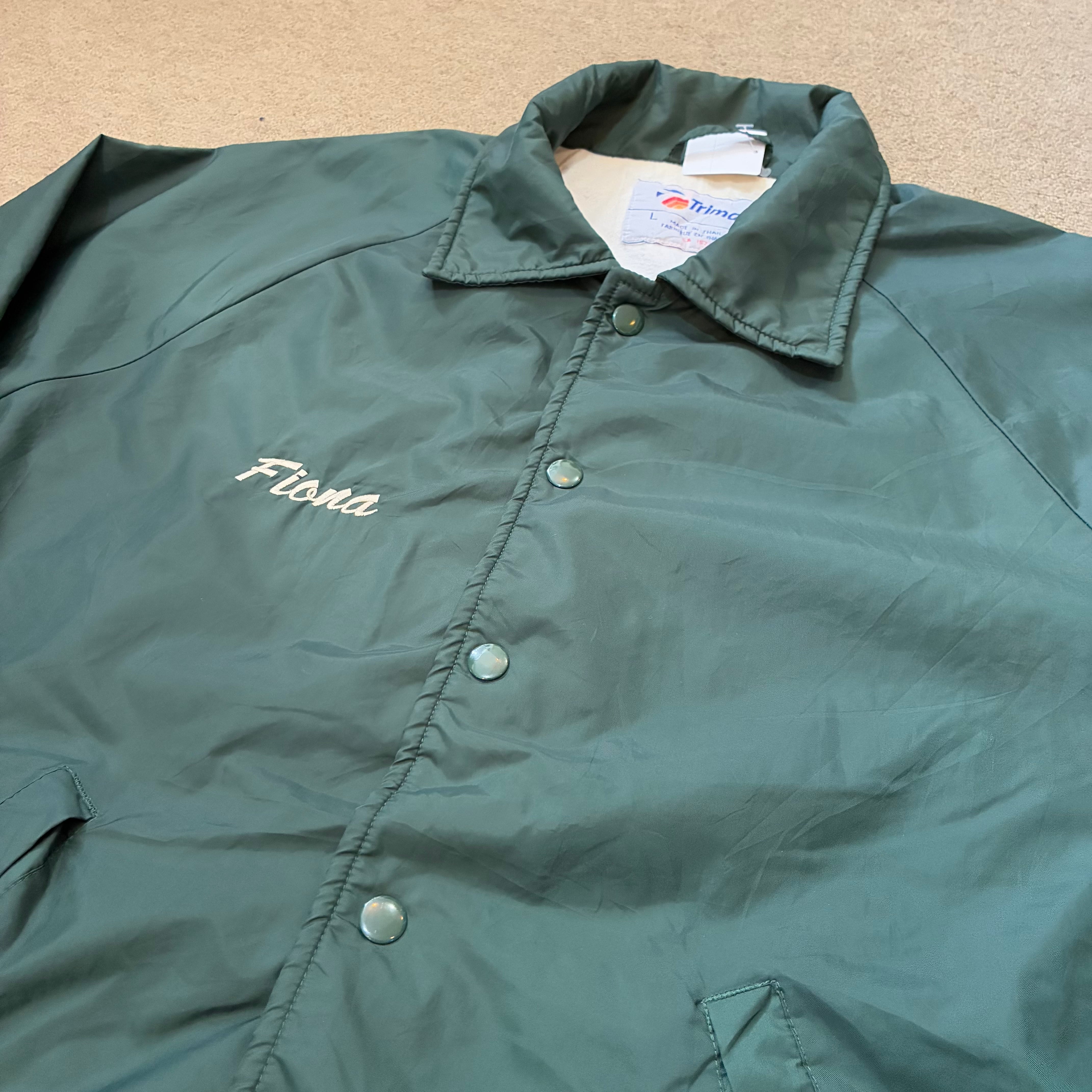 90年代のナイロンコーチジャケットになります。グリーンボディーに胸元、背中に刺繍ロゴは入ります。
