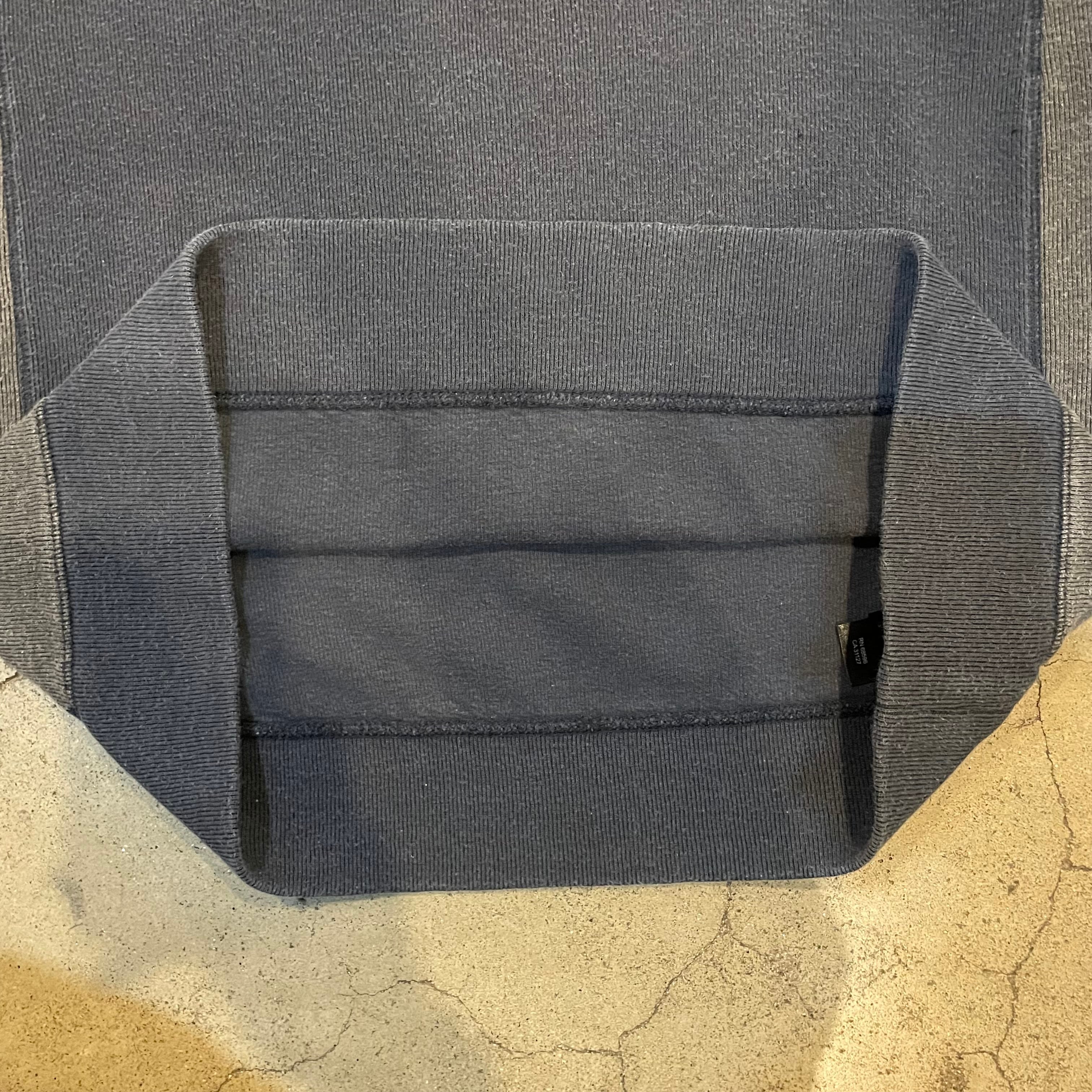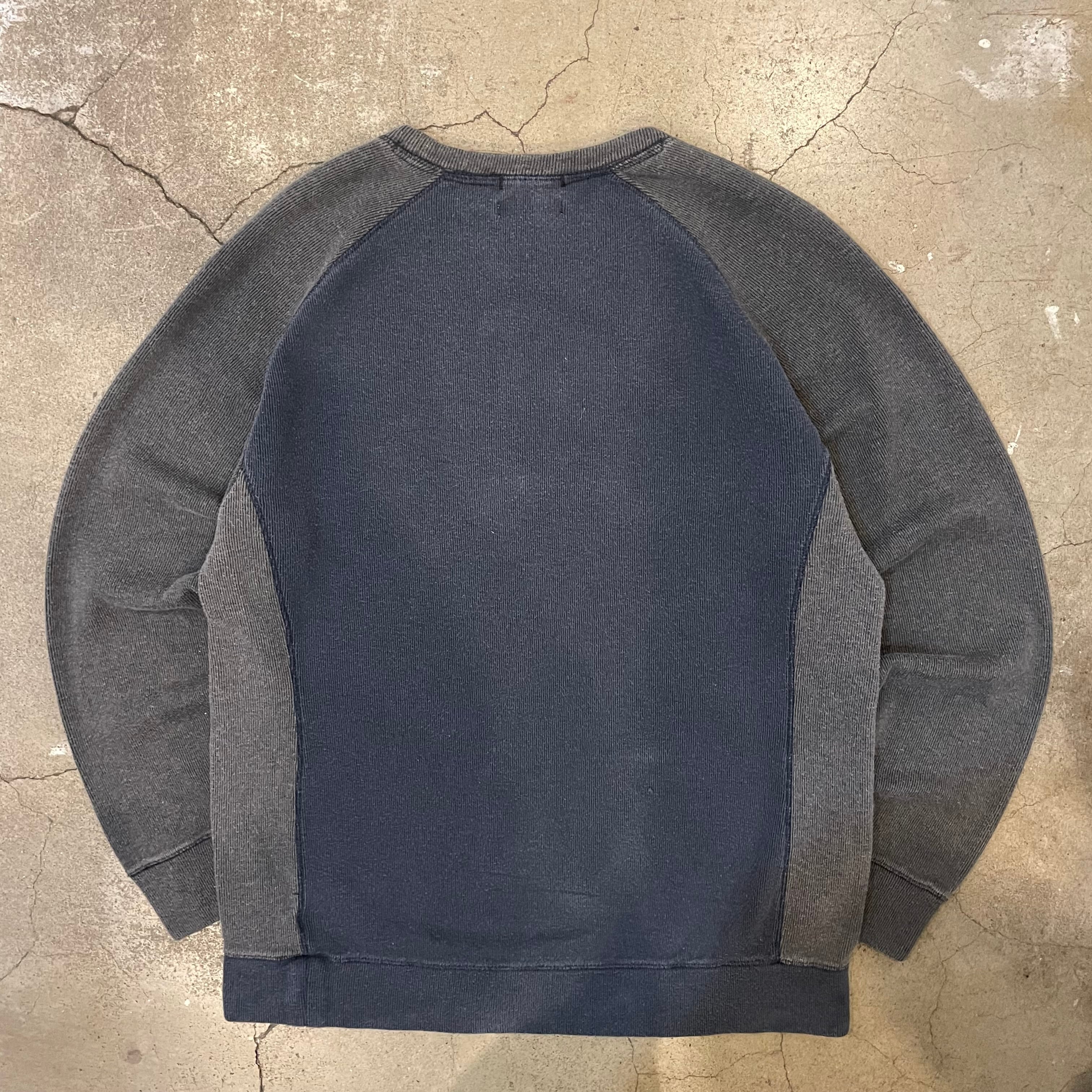 ボディはニット地で首はクルーネック、ネイビーとグレーのツートーンになります。