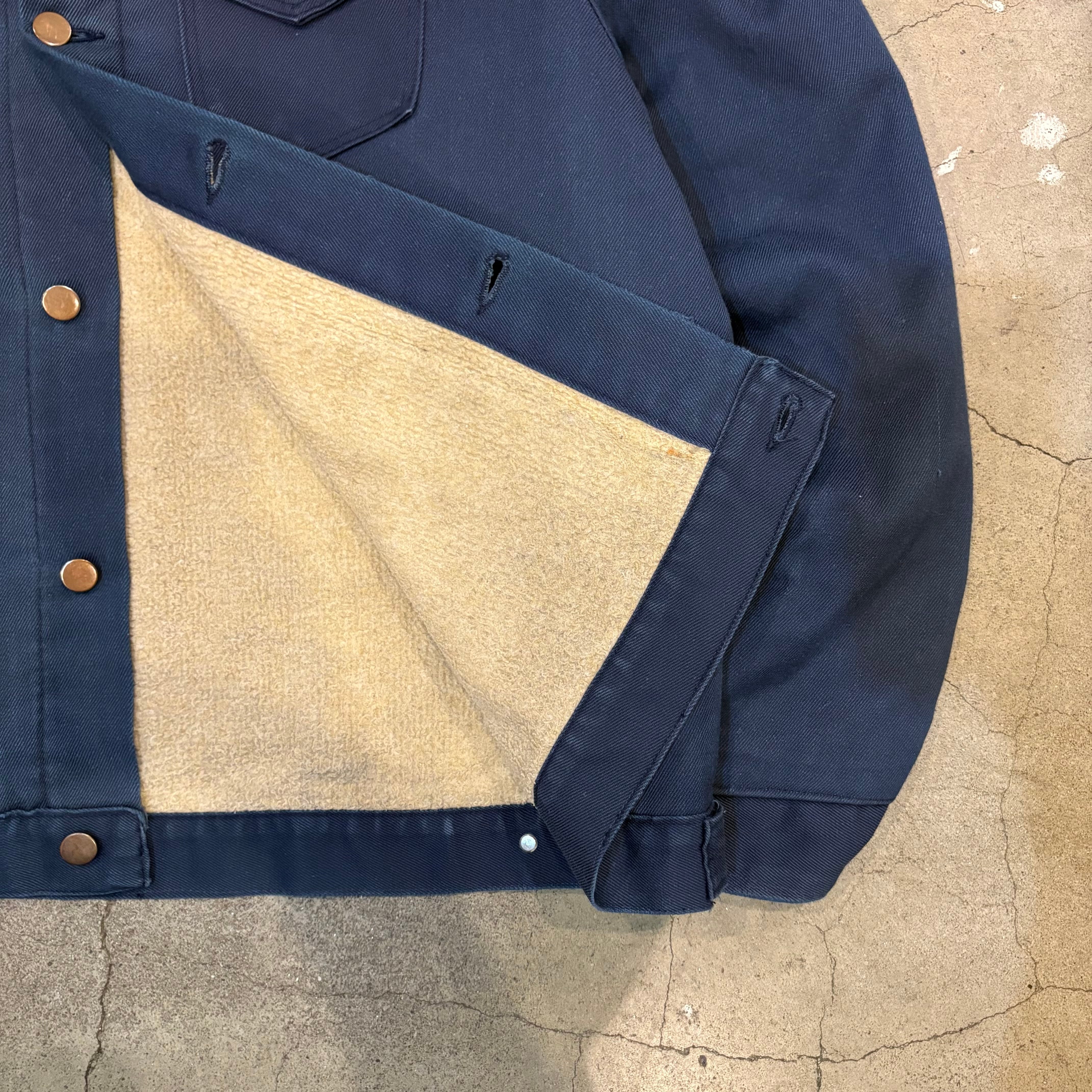 形はトラッカータイプでハンドウォーマーポケットも付いています。フロントと袖口はボタン、裏地はパイル、裾にはアジャスターが付いています。