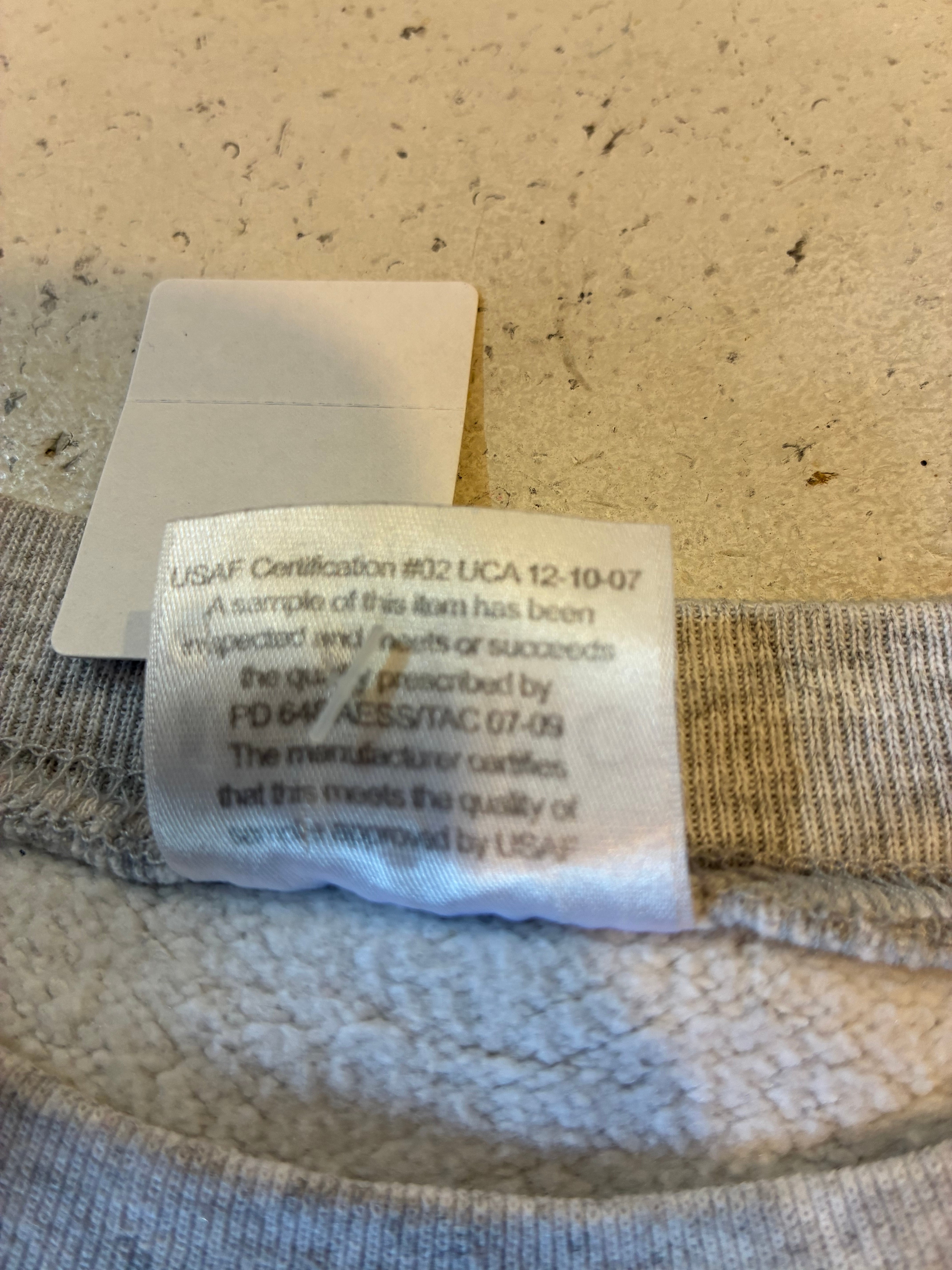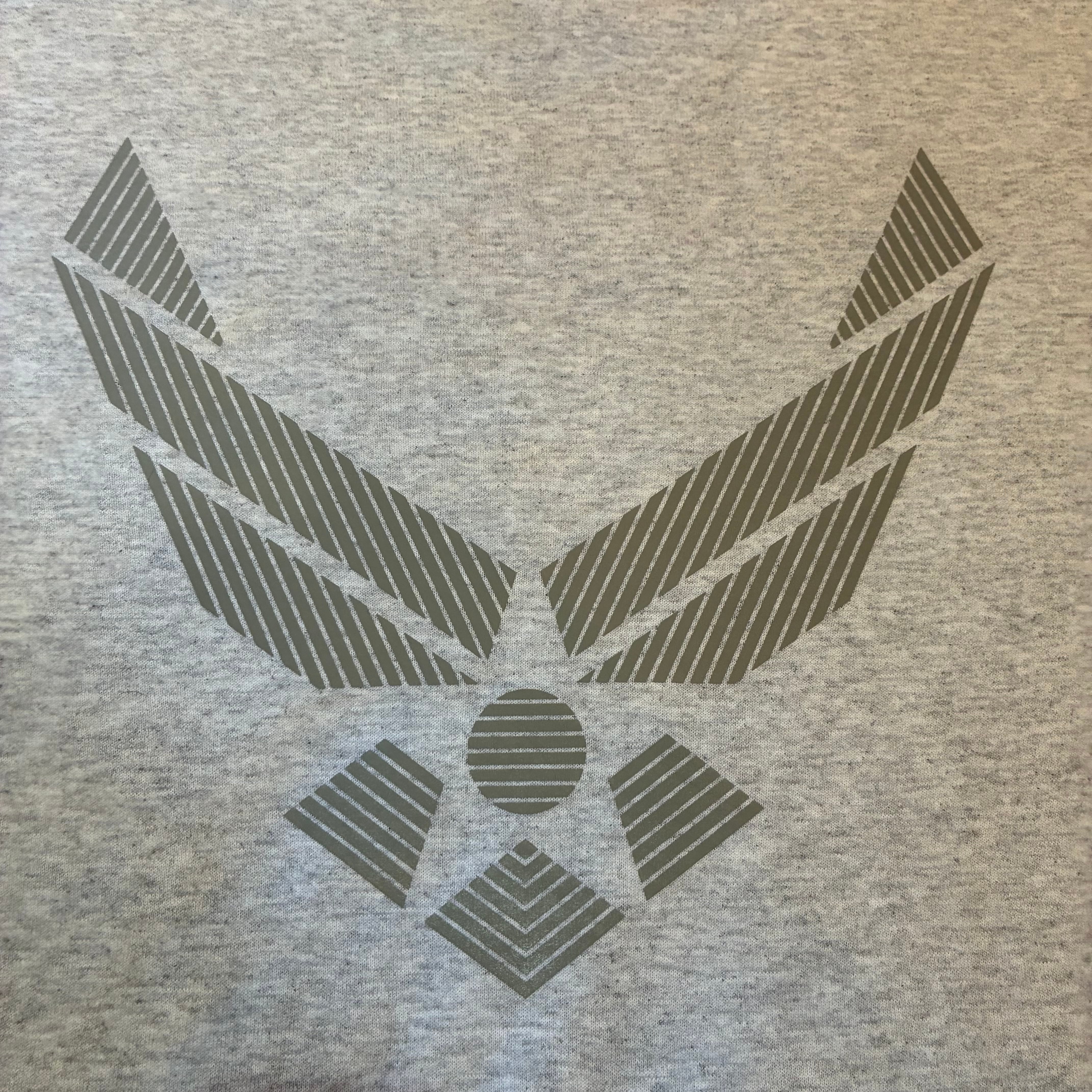 米空軍の兵士のトレーニングウェアとして製造された物。USA製です。両面リフレクタープリント入りです。ボディは霜降りグレー。
