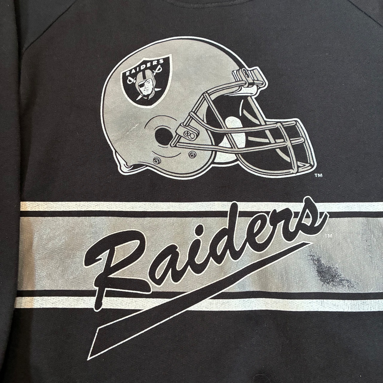 フロントにはヘルメットロゴと「Raiders」スクリプトロゴが大胆にプリントされたインパクト抜群の一枚。