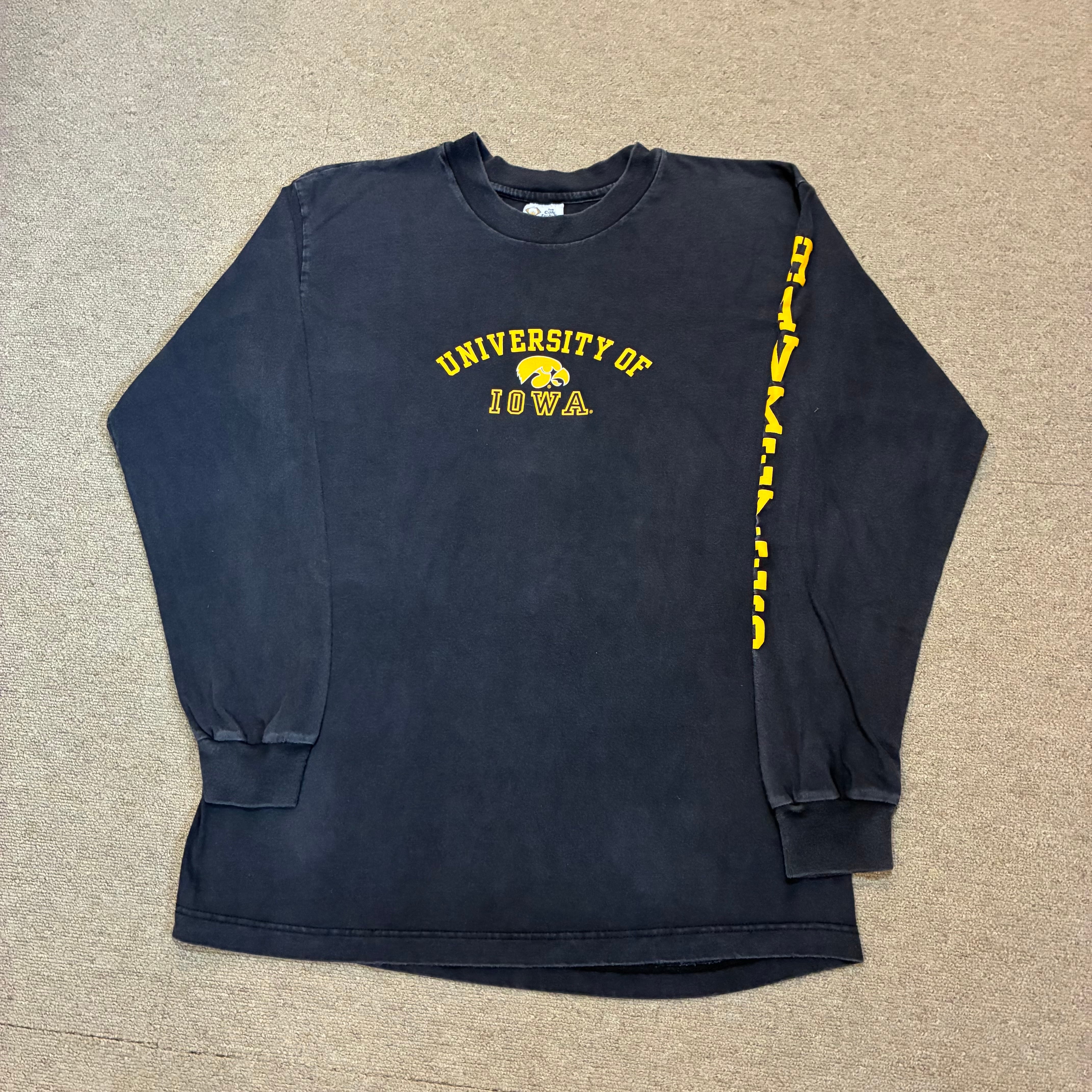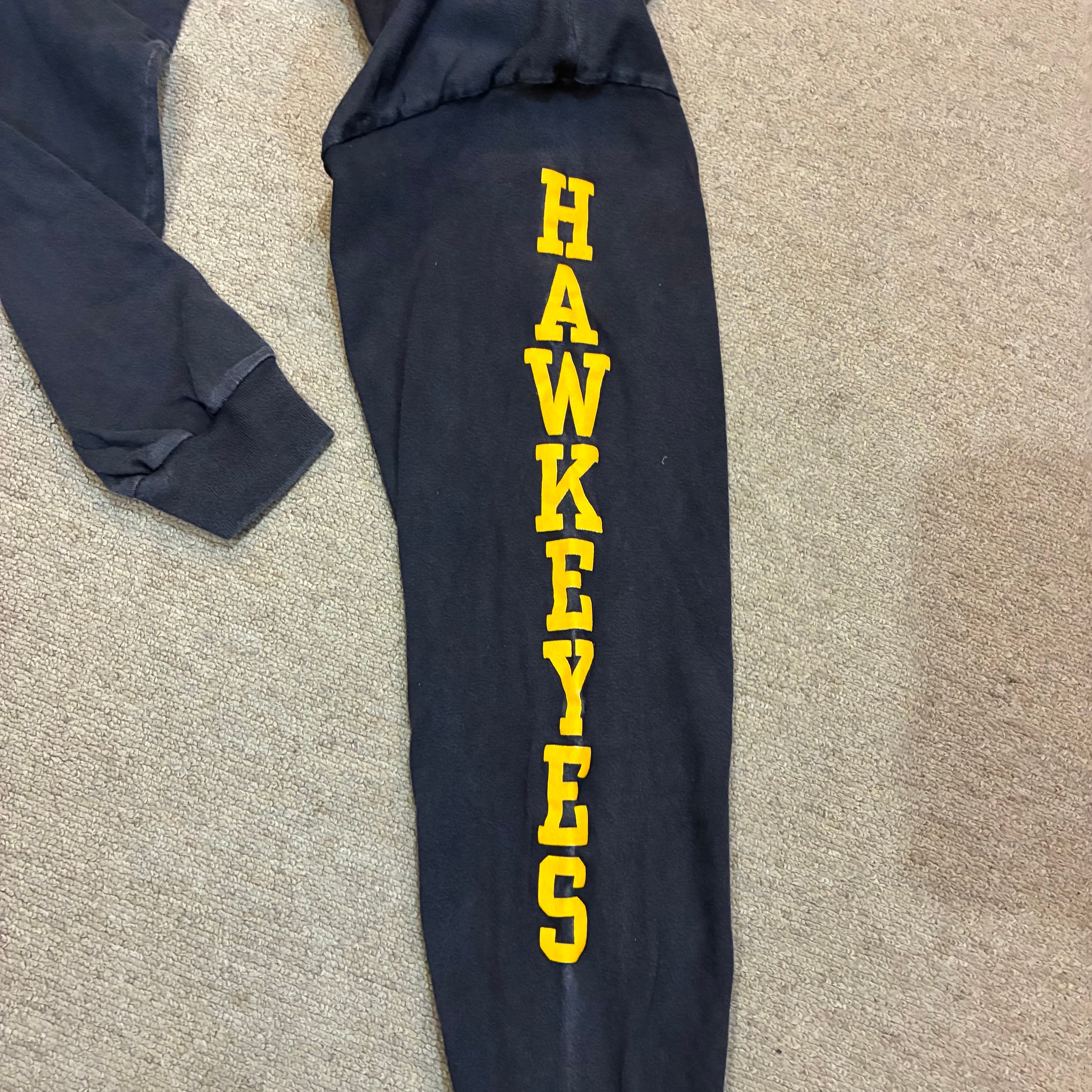 フロントには「UNIVERSITY OF IOWA」とアイコンロゴ、袖には“Hawkeyes”のプリント入りで存在感のある一着です。